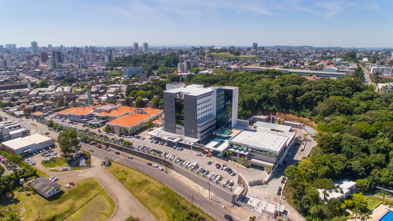 Tivemos a satisfação de participar da inauguração do Setor Materno Infantil do Hospital Unimed, localizado em Caxias do Sul, RS. Na vista aérea, vemos o Complexo Hospitalar Unimed em Caxias do Sul.